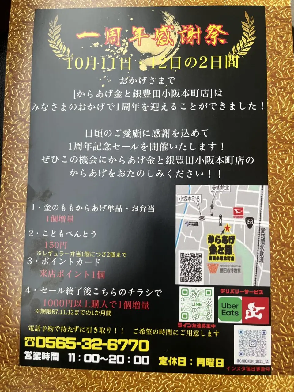 【豊田市】遊び心とおもてなしの「からあげ金と銀 豊田小坂本町店」が1周年。感謝祭が10月11日・12日に開催されます!
