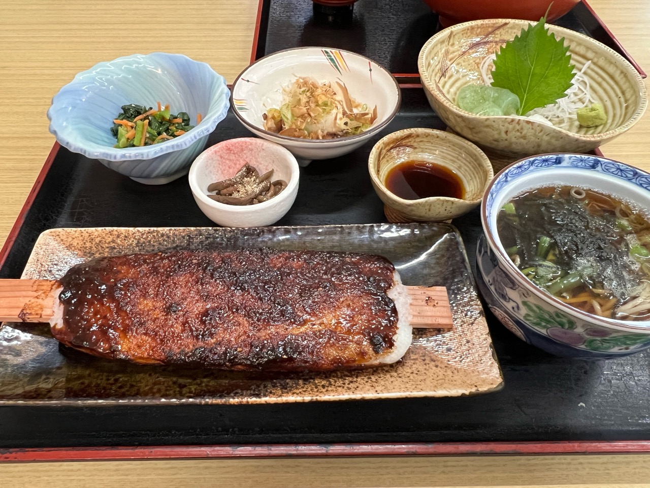 香ばしく焼き上げられた大きな五平餅は、味噌だれが絶妙。お刺身こんにゃくなど、地元らしい小鉢も添えられ、さまざまな味を楽しめます。