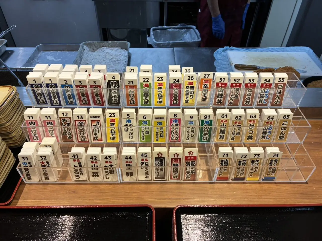 店内に入りますと、まずは食べたいお蕎麦・丼の札を取り、札置き場へ。
