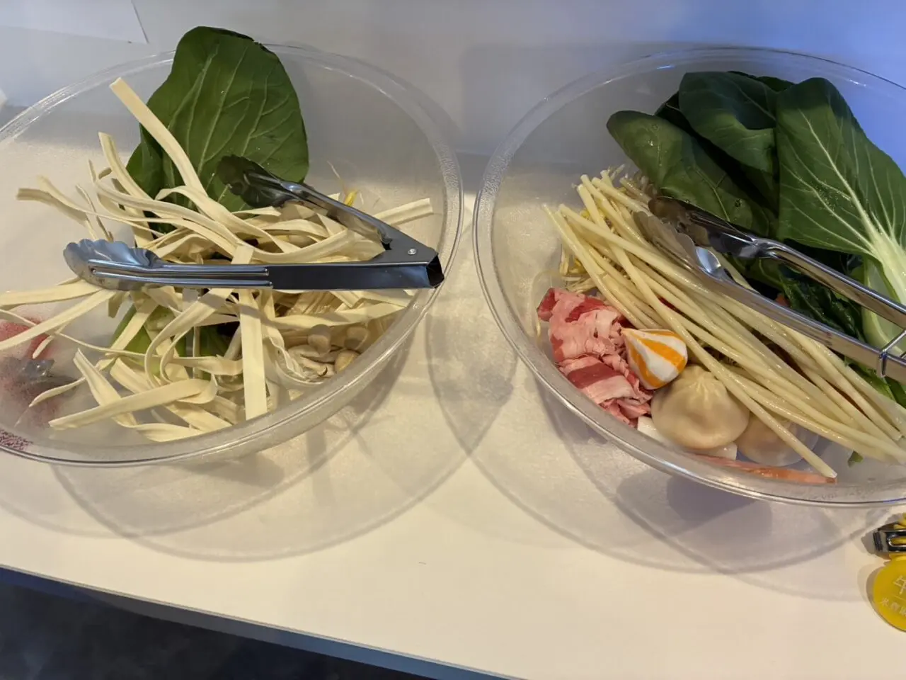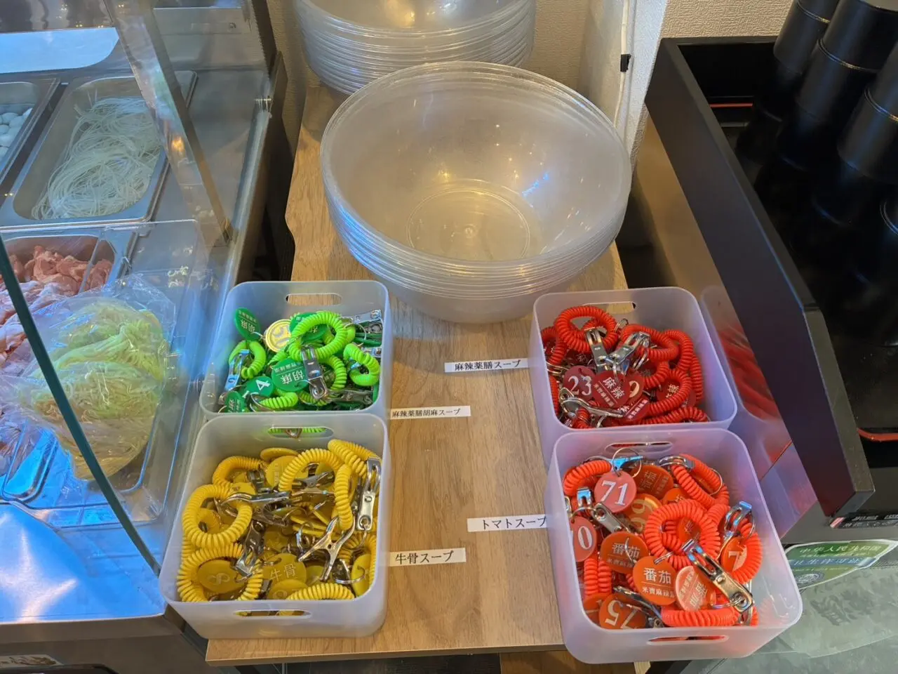 まずはお好みのスープの番号札がついたチェーンを1つ選び、ボウルとトングを持って好きな具材と麺を取ります。