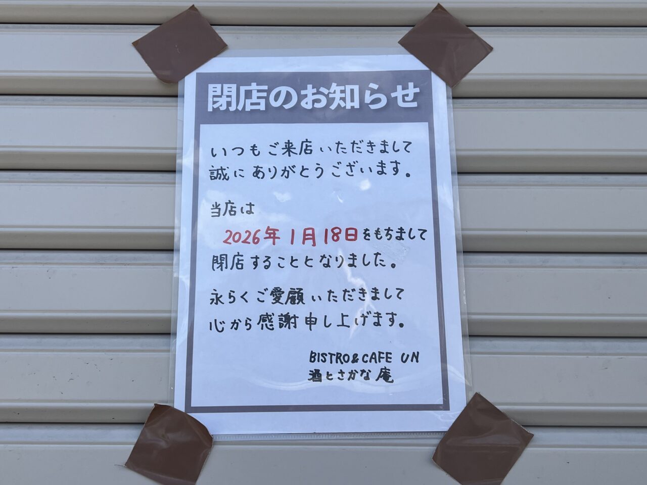 ランチタイムの「BISTRO&CAFE UN」と夜の部「酒とさかな 庵 -un-」が、2026年1月18日をもって閉店しているようです。