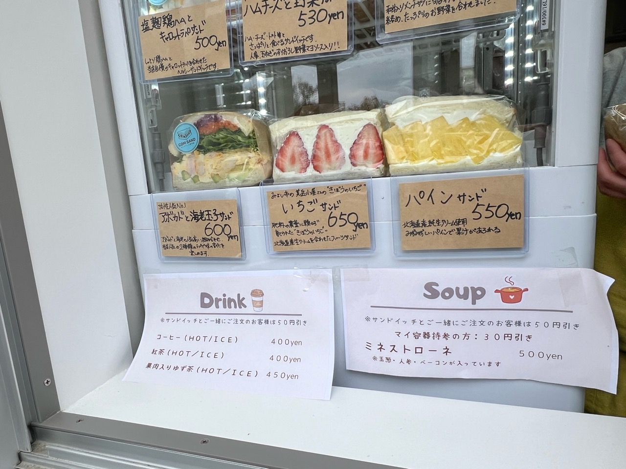 店頭で注文し、その場でお会計をするスタイルで、支払い方法は現金またはPayPayに対応しています。サンドイッチに合わせて、ドリンクやスープのセットも用意されていましたよ。