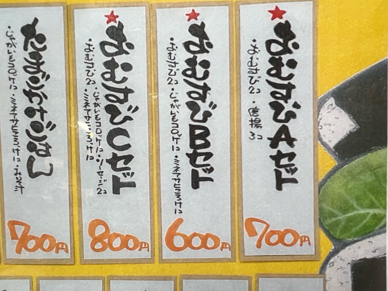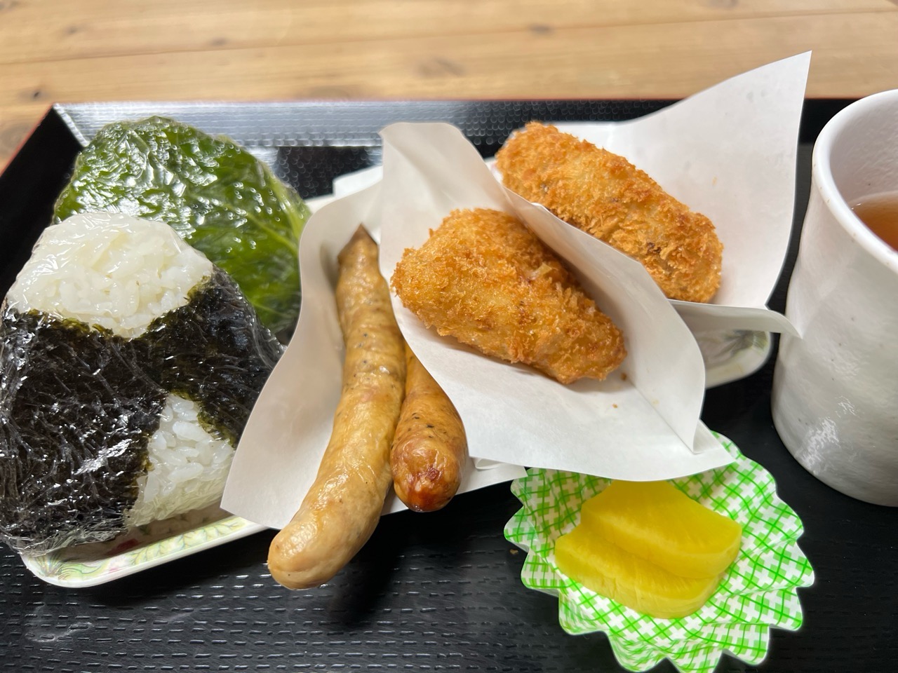 選べるおむすび2コに、山遊里のソーセージ2コ、じゃがいもコロッケ、ミネアサヒころっけが付いたセットで、おむすびは梅・塩・青菜の中から2つ選べました。