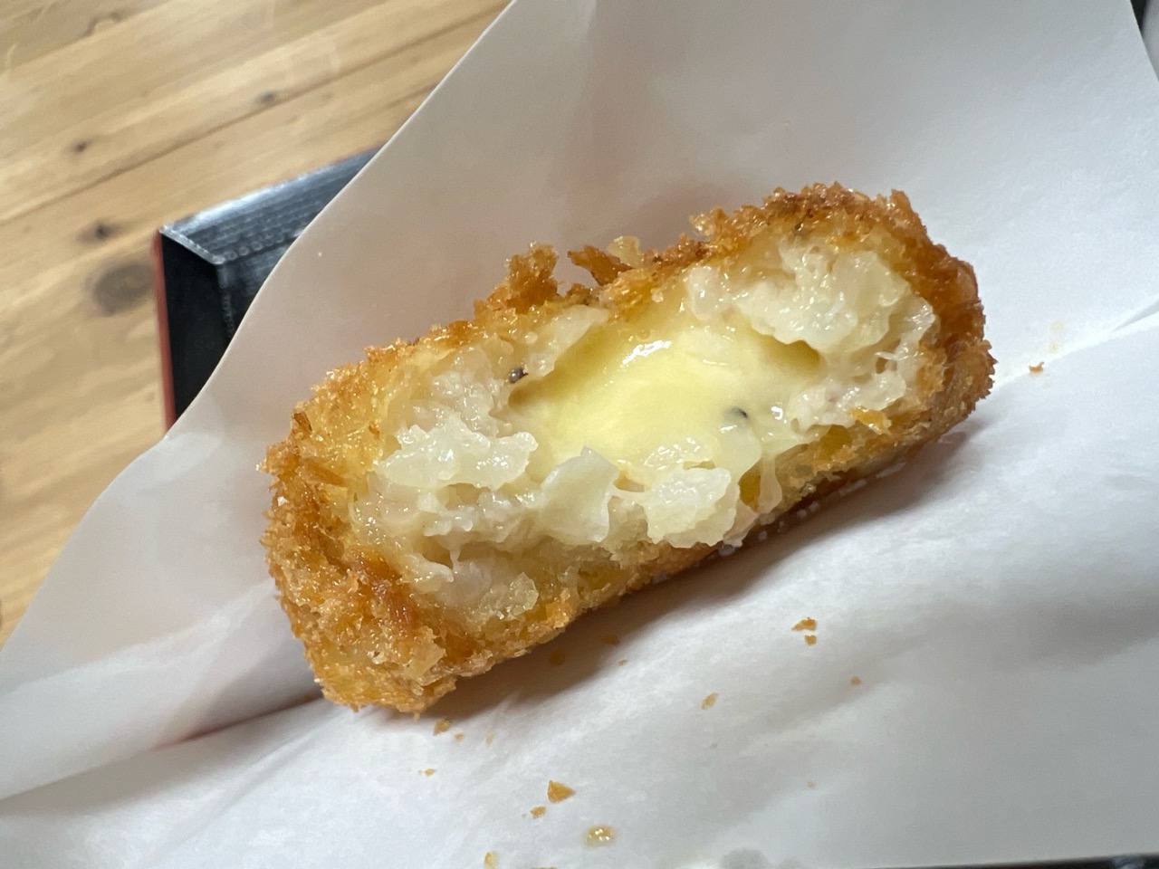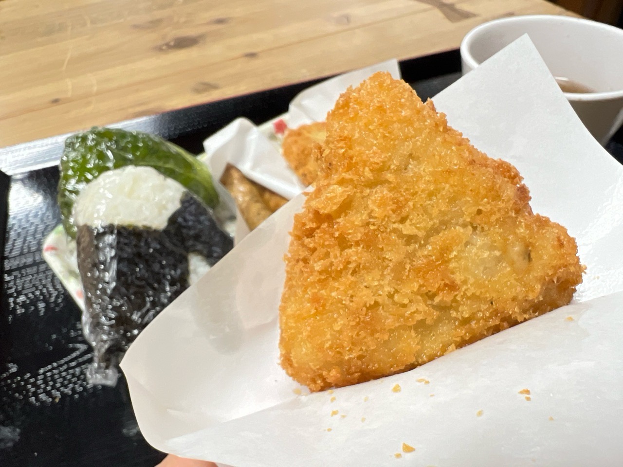 こちらは施設内の厨房で手作りされており、一つひとつ握っているため、形が少しずつ違うのも愛嬌。水車米をベースにしたクリーミーなライスコロッケで、中からとろりと溶け出すチーズがクセになる味わい。お子さんにも人気なのだそうです。