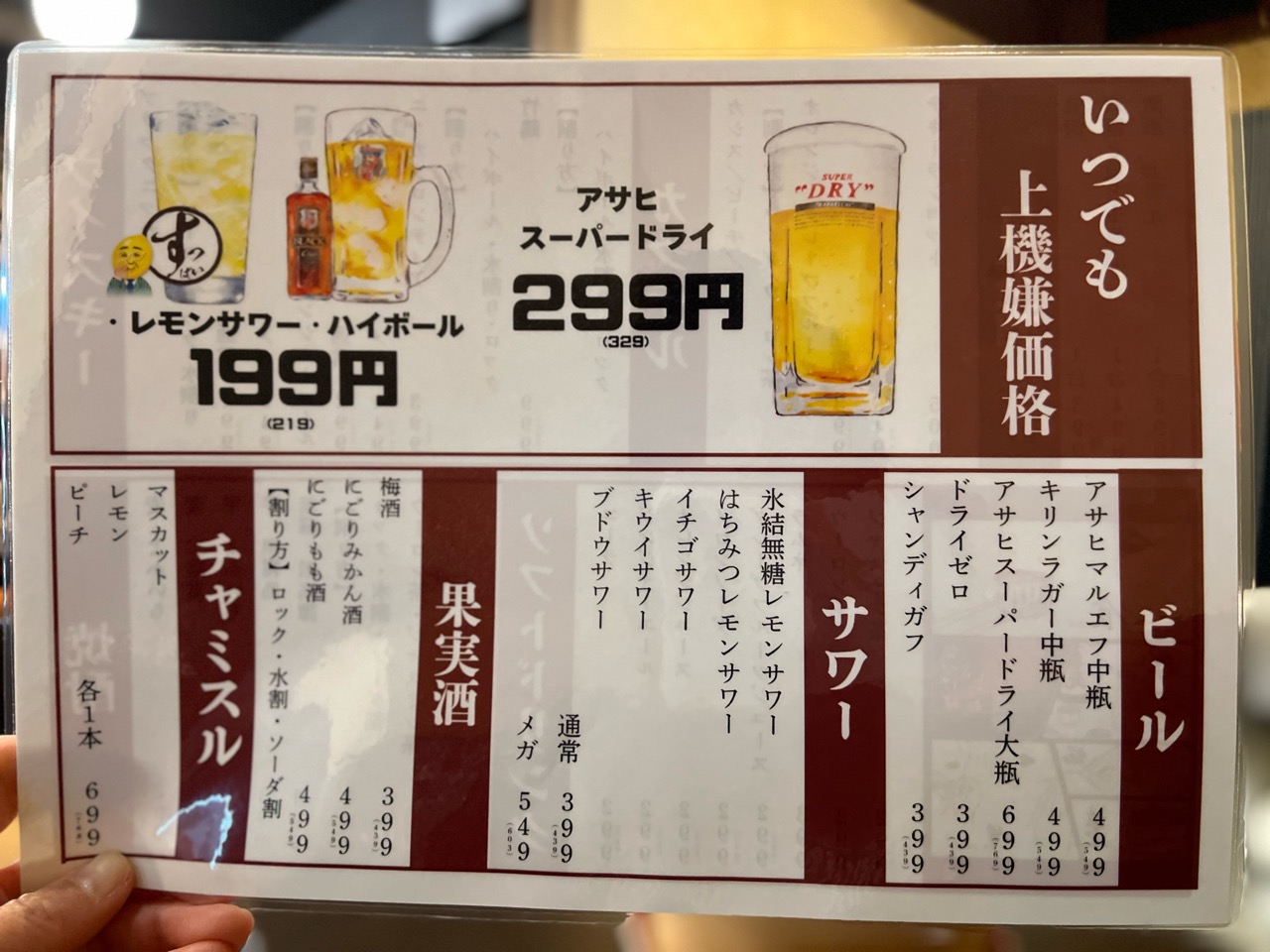 ドリンクは、アサヒスーパードライ329円、レモンサワー・ハイボール219円と良心的。