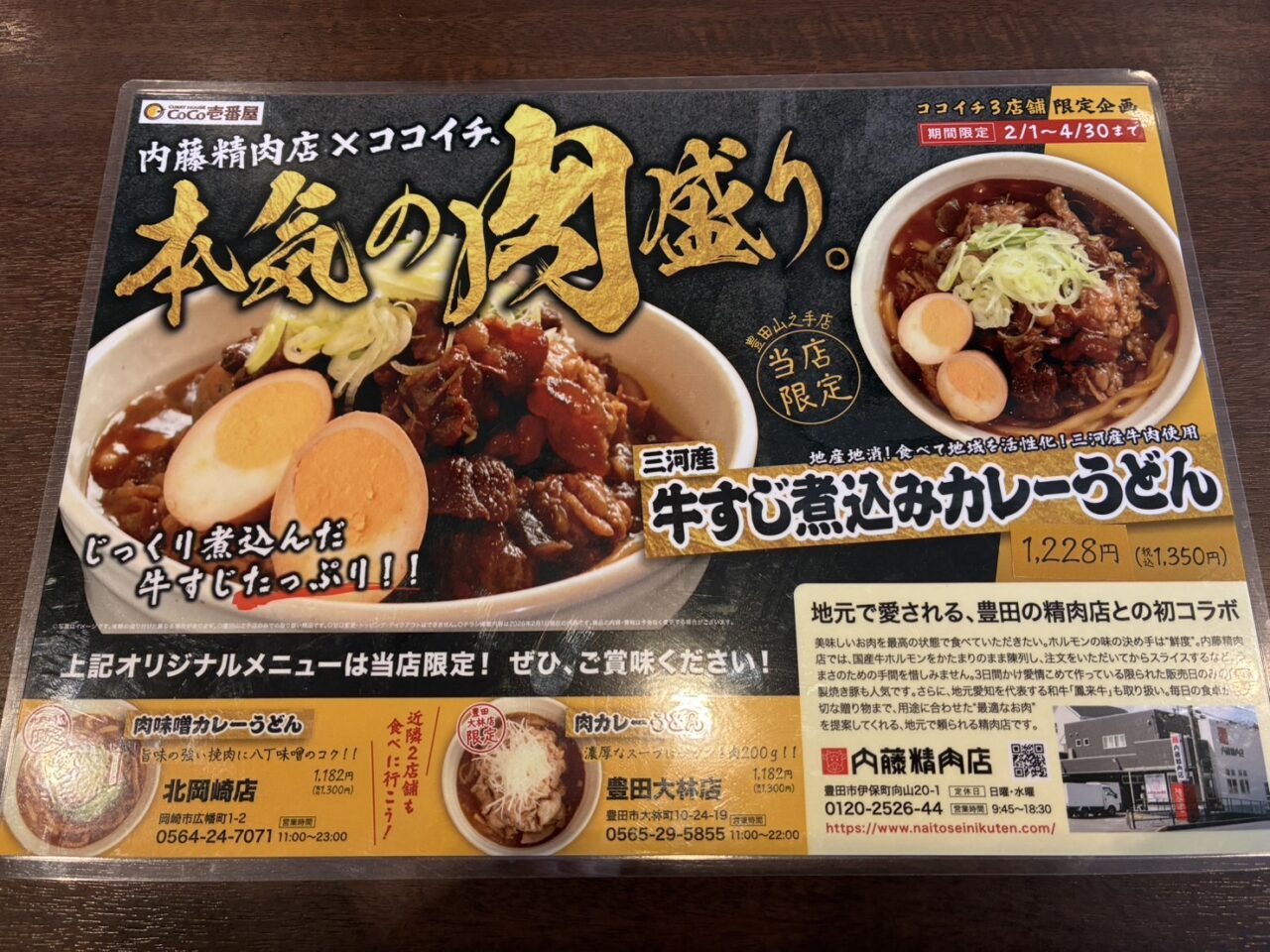 今回の企画は、豊田市伊保町の老舗精肉店「内藤精肉店」と、CoCo壱番屋の初コラボ。内藤精肉店が“本気で選んだお肉”と、ココイチのカレーうどんがタッグを組んだ、期間限定の特別メニューです。