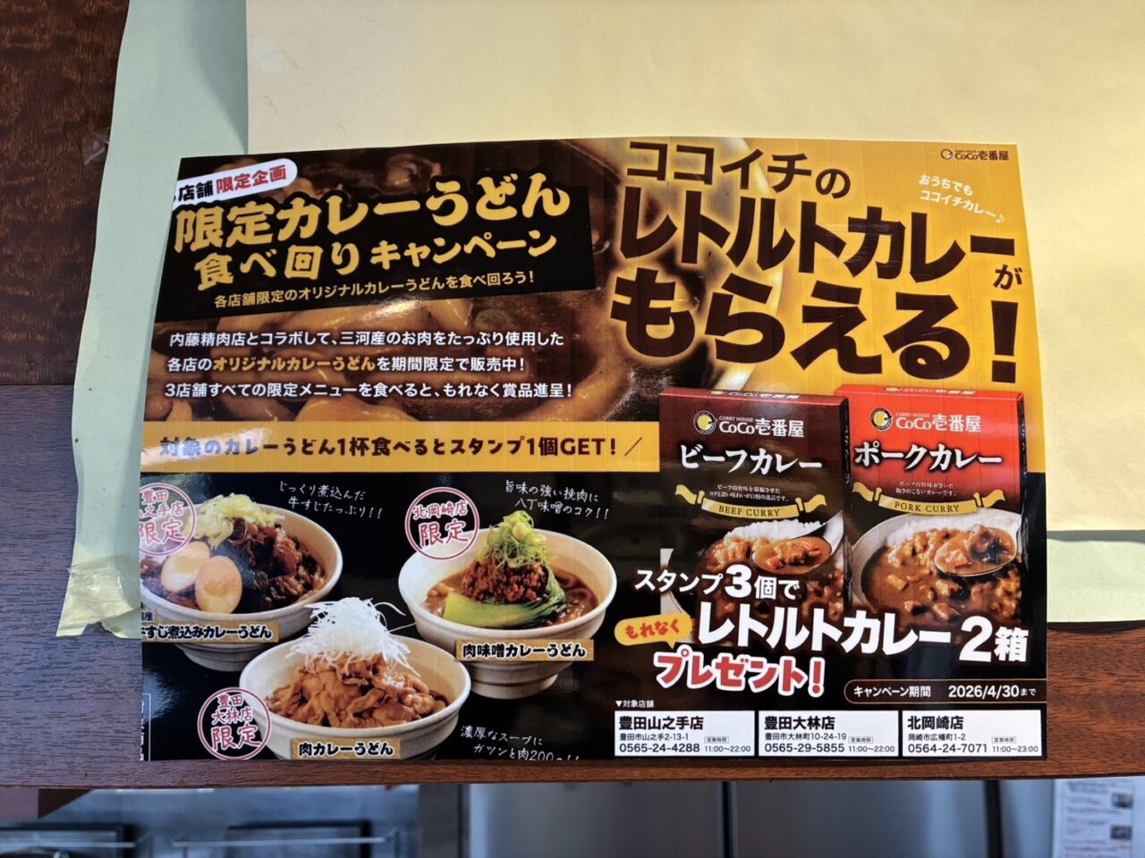 2026年2月1日〜4月30日まで、CoCo壱番屋「豊田山之手店」「豊田大林店」「北岡崎店」の3店舗限定で、『本気の肉盛り』カレーうどん企画が開催されています。