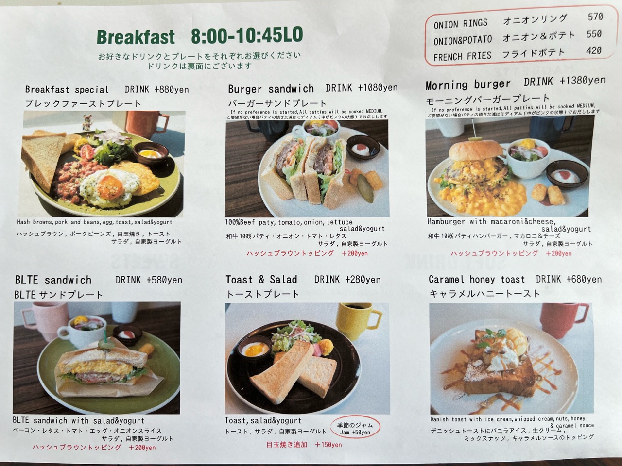 そのほかにも、ブレックファーストプレートをはじめ、モーニング限定のハンバーガーやキャラメルハニートーストなどのメニューがあり、追加トッピングでカスタムすることも◎