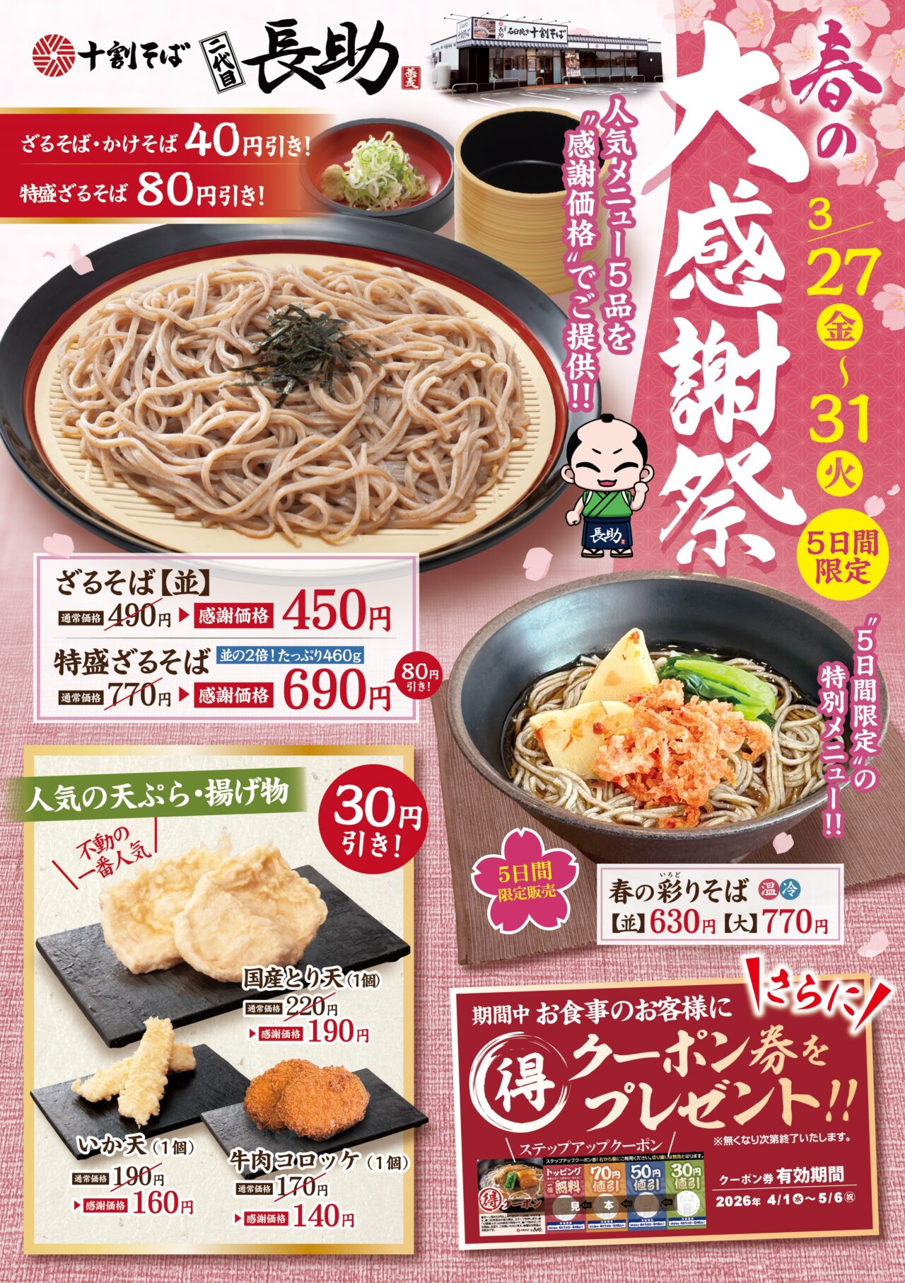加えて、5日間限定の「彩りそば」や、4月1日より使えるクーポン配布も実施。