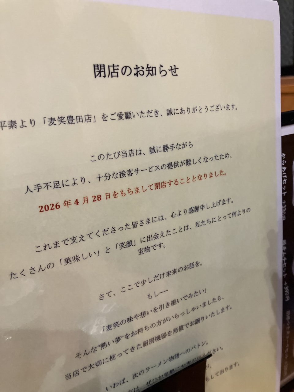 【豊田市】「麦笑 豊田店」が4月28日をもって閉店してしまうというお知らせをお寄せいただいております。