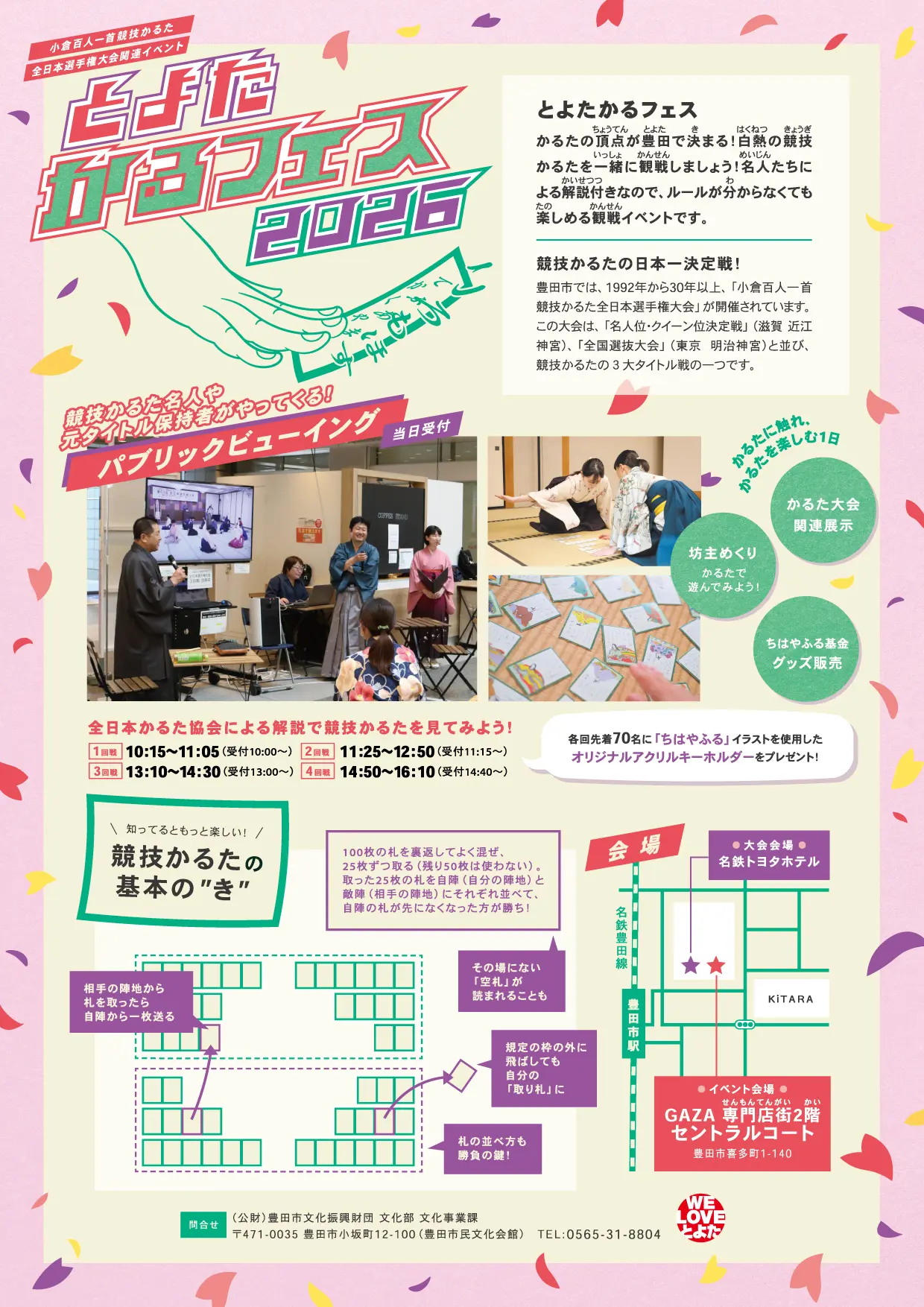 豊田市で開催される競技かるた日本一決定戦の試合を、パブリックビューイングで楽しめるイベントです。1992年から30年以上、豊田市で開催されている「小倉百人一首競技かるた全日本選手権大会」は、競技かるたの3大タイトル戦の1つなんだそうですよ。