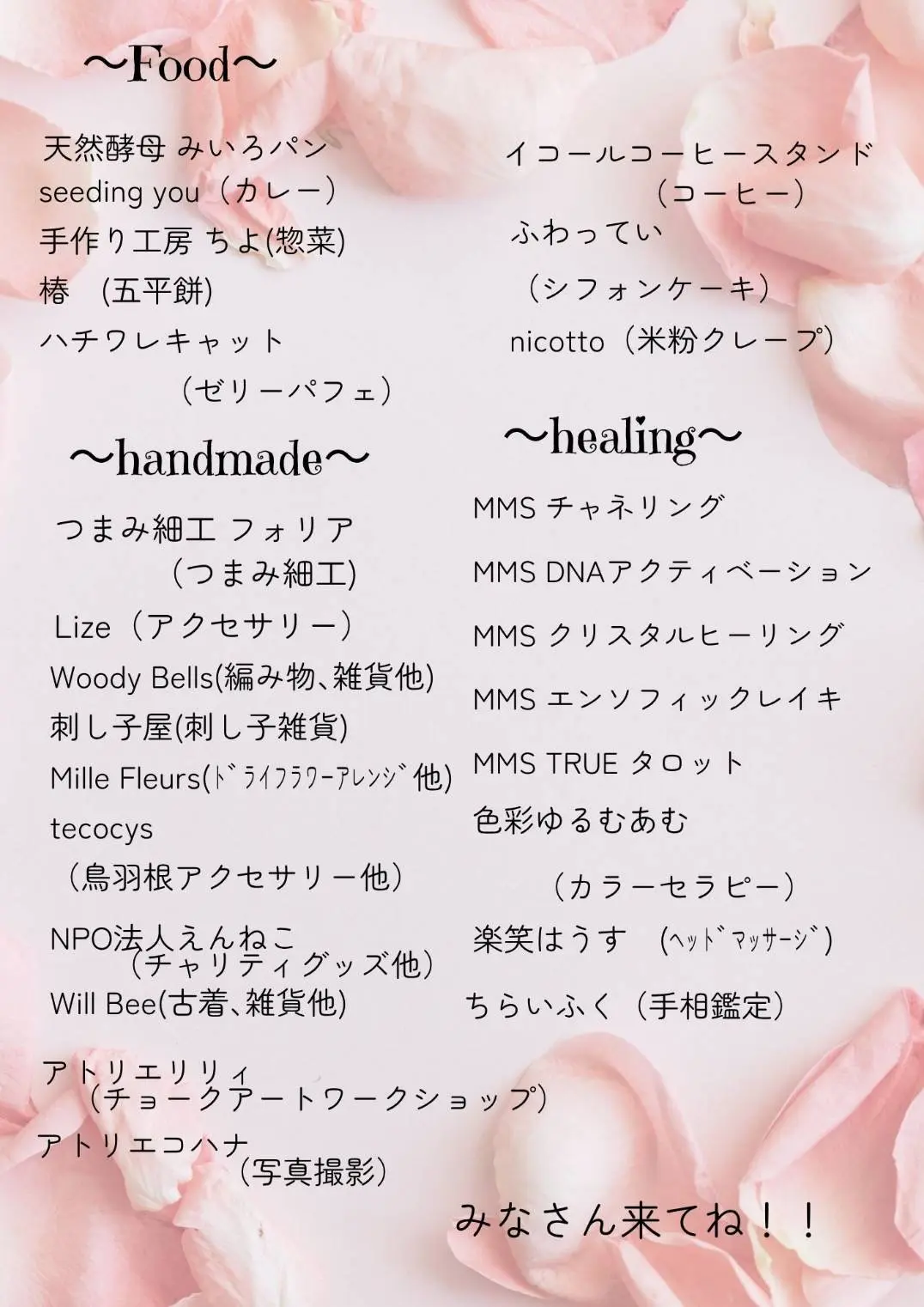天然酵母パン、アクセサリー、雑貨、キッチンカー、五平餅、ヒ-リングセッション マッサージ等々、魅力的なお店がたくさん並ぶ予定なんだそうです。