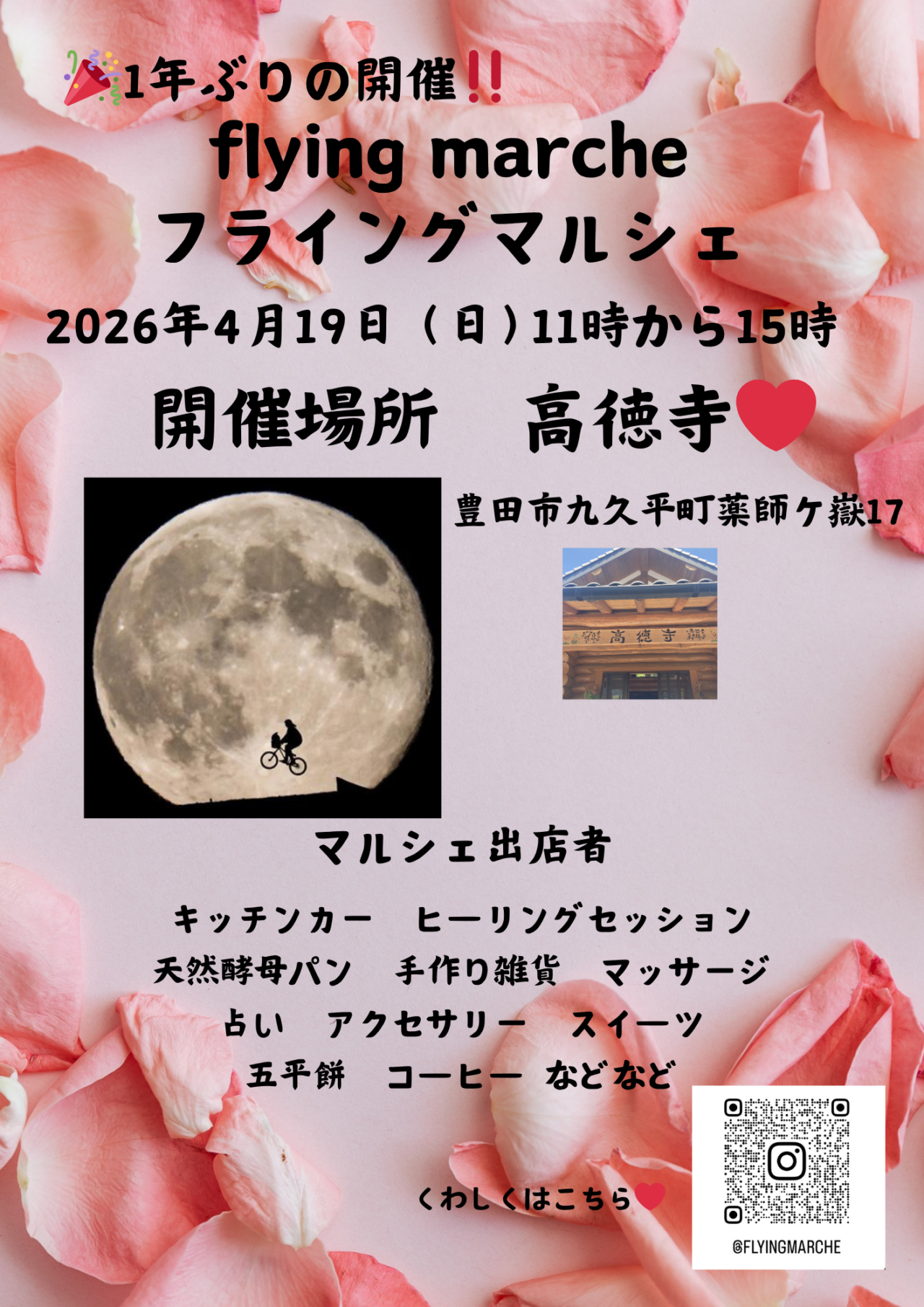 2026年4月19日(日)11時から、九久平町にある高徳寺で「フライングマルシェ」が開催されるそうです。