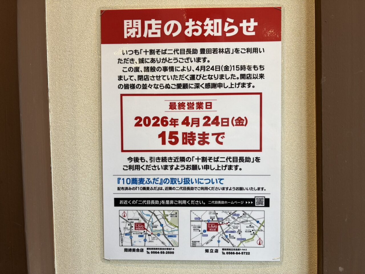 2026年4月24日15時をもって「十割そば二代目長助 豊田若林店」が閉店してしまうようで、お店にもお知らせが出ています↓