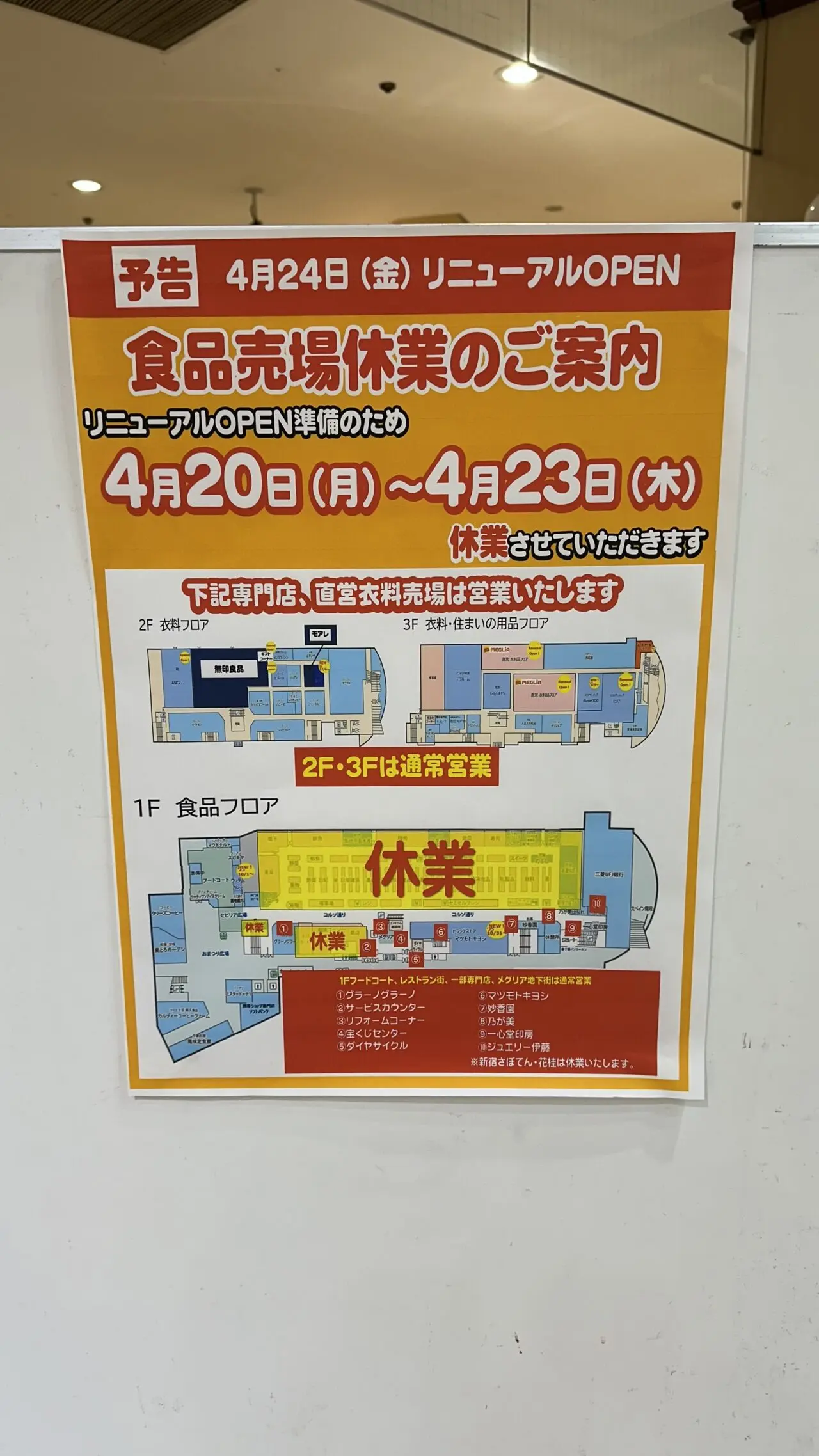 「メグリア本店の食料品売り場が、23日木曜までお休みです。」との情報&画像の提供をいただきました。